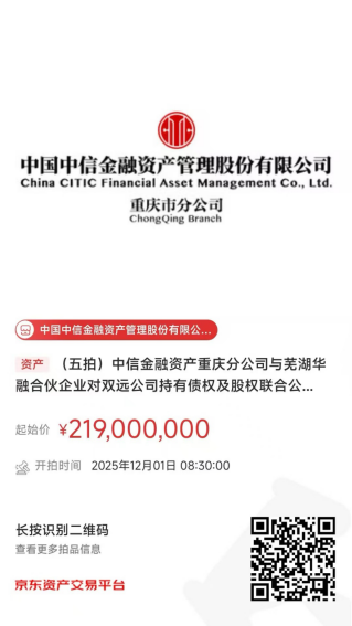 中國中信金融資產管理股份有限公司重慶市分公司(簡稱:中信金融資產重慶分公司)與蕪湖華融資本創(chuàng)榮投資中心(有限合伙)(簡稱:蕪湖華融合伙企業(yè))對重慶雙遠實業(yè)(集團)有限公司(簡稱:雙遠公司)持有債權及股權,將于2025年12月1日08時30分至2025年12月1日17時30分在京東拍賣網通過公開競價方式進行處置,拍賣鏈接如下圖所示,現(xiàn)予以公告。
