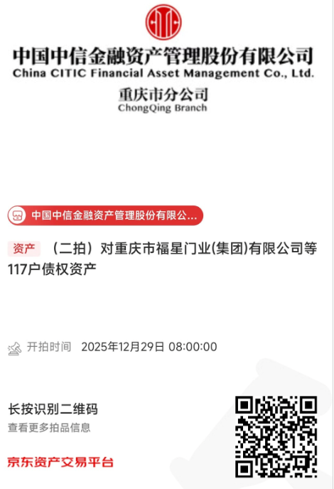 中國中信金融資產(chǎn)管理股份有限公司重慶市分公司(以下簡稱我分公司)擁有對重慶市福星門業(yè)(集團(tuán))有限公司等117戶不良債權(quán)資產(chǎn)。我分公司于2025年12月29日8:00至2025年12月30日17:30在京東拍賣網(wǎng)通過公開競價(jià)方式進(jìn)行處置,拍賣鏈接如下圖所示,現(xiàn)再次予以公告。